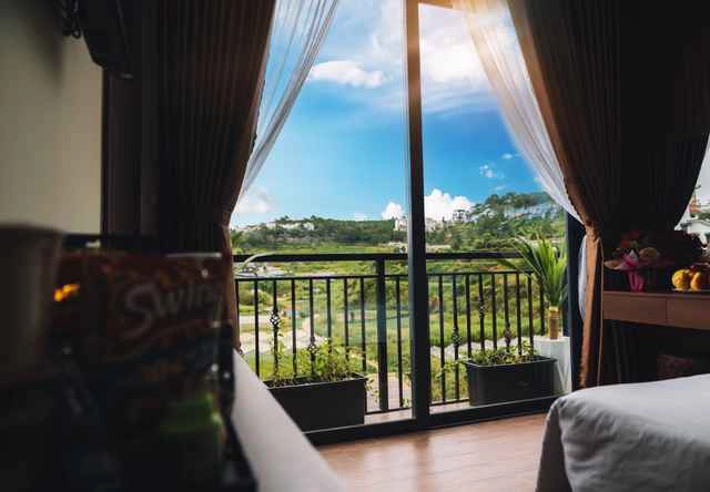 : Phòng nằm ở tầng thấp, có cửa sổ thông thoáng với view thiên nhiên Đà Lạt.